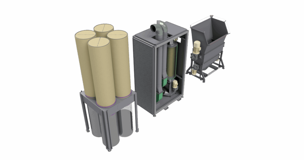 L’unità di depolverazione è progettata per separare le polveri dal materiale EPS macinato. Il materiale viene trasportato tramite una coclea a spazzole motorizzata all’interno di un cilindro forato dotato di sistema di aspirazione.